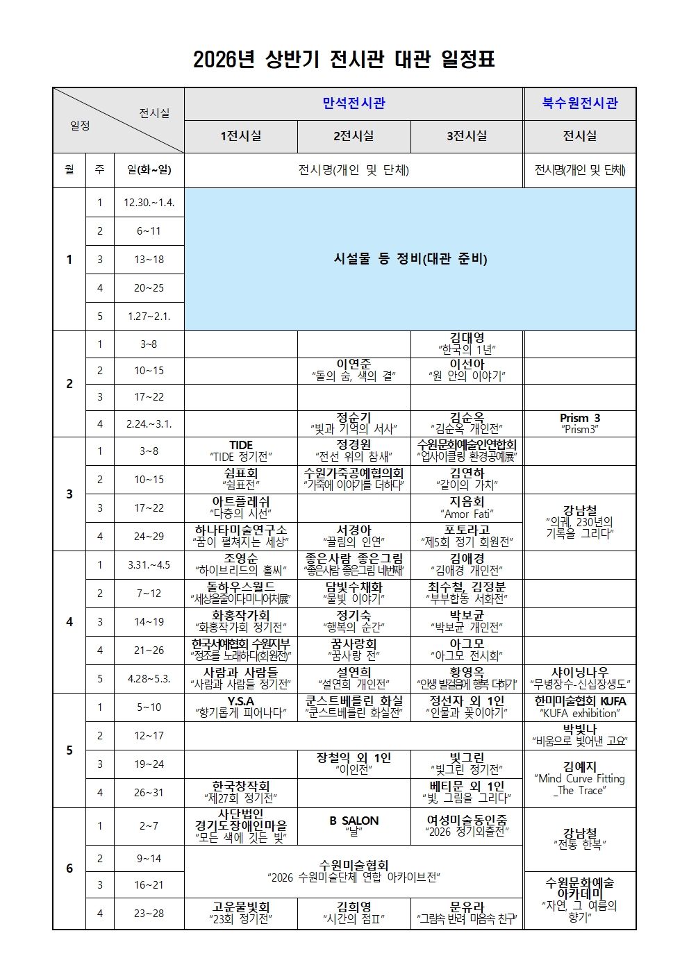 1. 전시오픈행사는 반드시 수원시립만석전시관(수원시립북수원전시관) 폐관시간 전에 마감되어야 합니다.